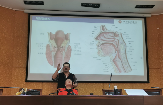 首先,他结合图示生动介绍了人体歌唱的“乐器”构造以及发声动态影像,让师生更好了解发声原理。其次,详细讲述了科学发声的具体做法,提出了师生用嗓的基本原则,即在歌唱时注重省力,实现“松、通、空”。随后,他列举声带常见病变案例,介绍中医药嗓音治疗优势。最后,结合自己的工作经验,分享了喉关节按摩、吊嗓、声休三种嗓音保健常识,通过现场互动给三位老师进行喉关节按摩和示范指导。